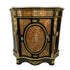 Impresionante boulle época Napoleón III de madera laqueada negra con incrustaciones de bronce, conchaperla y carey rojo. Decorado con monturas de bronce ormolú representando cariátides en ambos lados. Con una puerta central y cubierta de mármol blanco característico de la época.