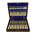 Estuche Eduardo VII con cuchillos y tenedores para postres con motivos de tallos y púas en las hojas de los cuchillos y tenedores. Todo alojado en su caja original de caoba.