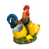 Gallo de bisque alemán pintado en una escena con un huevo y un pollo todo sobre un suelo pintado con plantas.