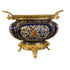 Gran centro francés de mayólica con motivos clásicos de un Grifo rodeados de hojas de palmeras todo sobre un fondo azul rey y adorando con asas en bronce ormolú y base circular con cabezas y patas de león. SXIX