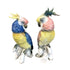 Gran par de cacatúas de porcelana alemana con vivos en colores rosa, azul y amarillo. parados sobre una rama blanca.