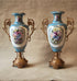 Pareja de jarrones de porcelana decorados con flores en reservas con vivos dorados sobre un fondo azul celeste. Con asas y base en bronce Ormolu
