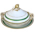 Par de soperas de porcelana francesa con plato redondo estilo Neo-clásico con vivos verde rey y márgenes dorados al fuego con tapa decorada con una piña central con pintura al oro. Asas entrelazadas