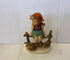 Porcelana alemana Hummels de una niñita sentada sobre una banca con una canasta.