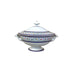 Sopera francesa Limoge modelo Etiolles estilo Neo-clásica decorada con flores en guirnalda y vivos de azul rey y dorado al fuego. Con asas curvas y vivos dorados.