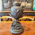 Jarrón de bronce Meiji de forma ovoide, decorado en relieve que representa a un Shoki sostenido por su bastón bajo un pino a un lado, y un estornino posado en una rama florida al otro. Esta flanqueado por dos asas en forma de dragones sinuosos que descansan sobre una base circular sostenido por un dragón enroscado en busca de la perla.