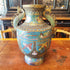 Jarrón de cloissone japones Meiji decorado con fénix en su parte media y samuráis en su parte superior todo sobre un fondo calipso con vivos dorados. Muestra dos asas en forma de quimeras de color verde con manillas. Todo sobre una base circular decorada con flores de loto. Japón época Meiji SXIX.