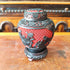 Jarrón de jengibre de laca china cinnabar o "cinabrio" roja y negra. Esta decorado con motivos de follaje y flores en negro sobre un fondo rojo fuerte. China SXIX.