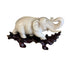 Primoroso marfil japones Meiji de un elefante con la trompa levantada y apoyada sobre su cabeza apoyado sobre una peana de madera de cerezo. Muestra las clásicas proporciones artísticas del periodo Meiji.