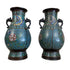 Par de Cloissones japoneses esmaltados con aves fénix, mariposas y flora de la época con fondo de dibujos geométricos y asas de dragones. Época MEIJI