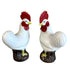 Par de gallos chinos esmaltados blancos con cresta roja descansando sobre una tronco.