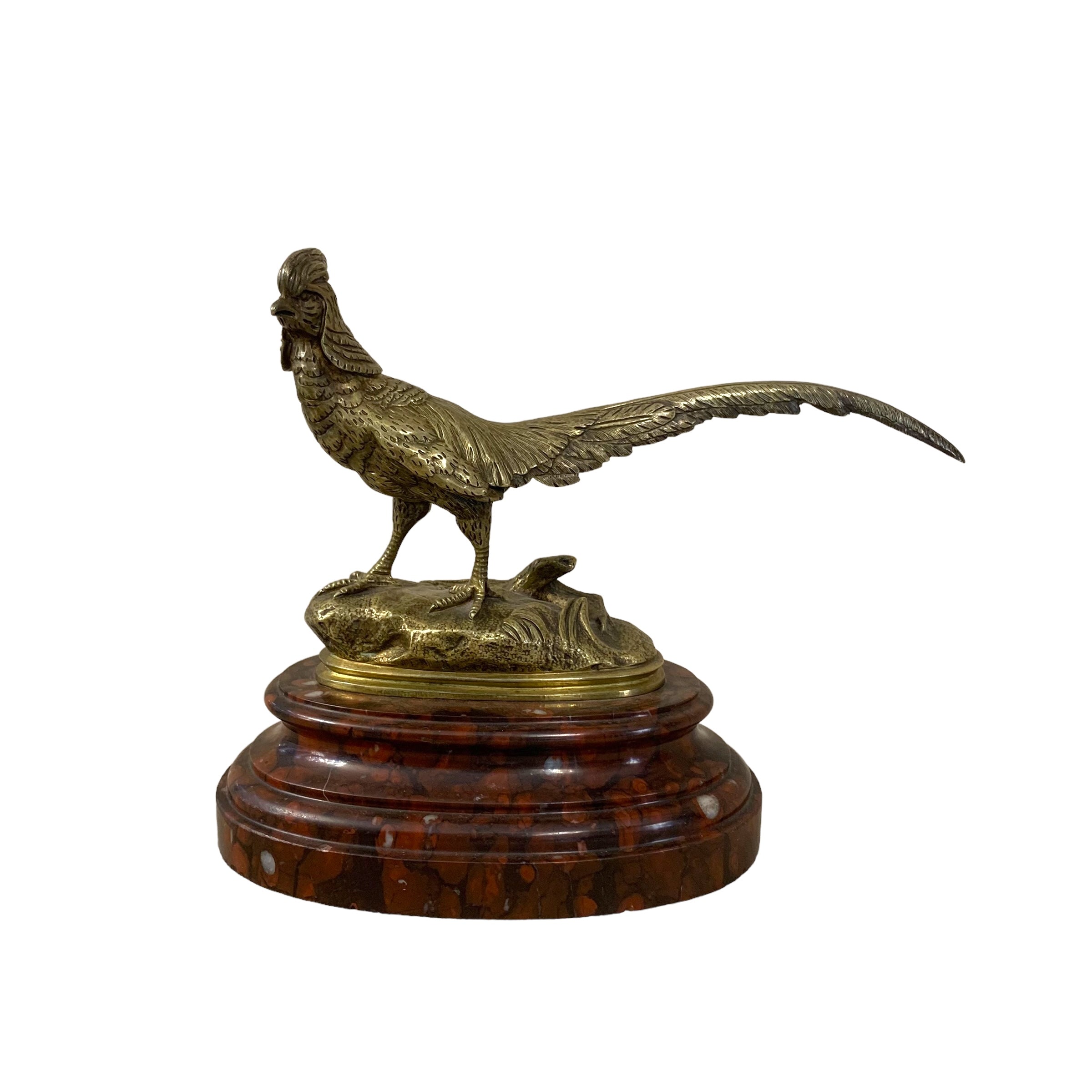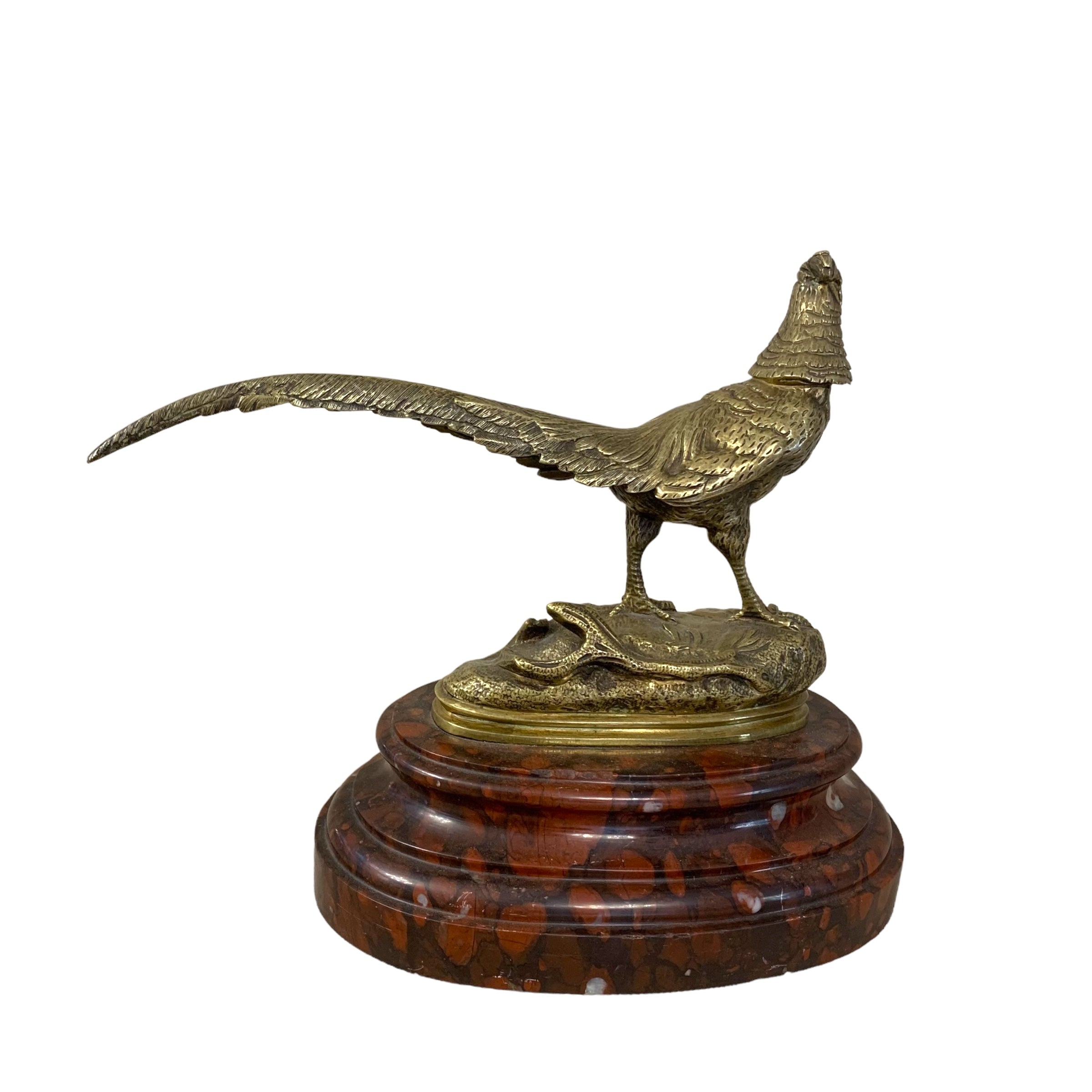 Escultura de un faisán dorado con su clásica capucha y larga cola todo sobre un base de mármol roja y negra. Escuela francesa. SXIX.