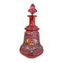 Botella veneciana con motivos florales y geométricos color fucsia con tapón en forma de campana con coronación dorada.