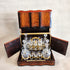 Gran cava licor o "cave a liqueur" de 16 copas y 4 decantadores todos con vivos en dorado al fuego y sostenedor de bronce ormolu. La caja es de raíz de nogal del Cáucaso y con vivos dorados y coronación central. Época Napoleón III 1852-1870