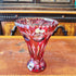 Florero de cristal alemán color rubí de boca ancha decorado con hojas, tallos y lonjas en color transparente y de decorado en su parte superior con lonjas circulares. Alemania SXX.