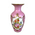 Jarrón de porcelana francesa pintada con fondo rosado y motivos florales con vivos blancos y dorados.