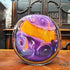 Jarrón soliflore de vidrio soplado, decorado con motivos en forma de volutas en tonos purpuras, rojo y amarillo. Firmado en la base, numerado bajo la base E68/2002.