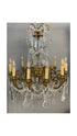 Lámpara francesa estilo Luis XV "rococó" de 12 brazos, 12 luces con bronce ormolú cincelado con motivos florales y columnas en punta. Todo decorado con lágrimas y rosarios de cristal