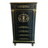 Chiffonier francés Boulle de madera laqueada negra con incrustaciones de bronce y nacar con motivos griegos de follaje con copón central y laterales con motivos de columnas de corintios. Posee 4 cajones. En su interior está cubierto con marquetería de raiz de nogal con dos cajones y una base para escribir cubierta de cuero rojo con roulette. Cubierta de mármol rosa pálido.