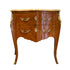 Elegante cómoda francesa de caoba con marquetería de arboles frutales de dos cajones, tiradores en bronce y cubierta de mármol amarillo pálido. Muestra un diseño florar.
