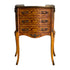 Pequeña cómoda de tres cajones con baranda y marquetería en forma floral en su superficie. Patas largas estilizadas realzadas en bronce ormolu.