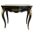Mesa de juego de madera laqueada negra época Napoleón III con ornamentación de bronce ormolú y nacar, con motivos de follaje. Con patas en cabriolet con terminación en pata de león de bronce. Su interior está tapizado con terciopelo verde