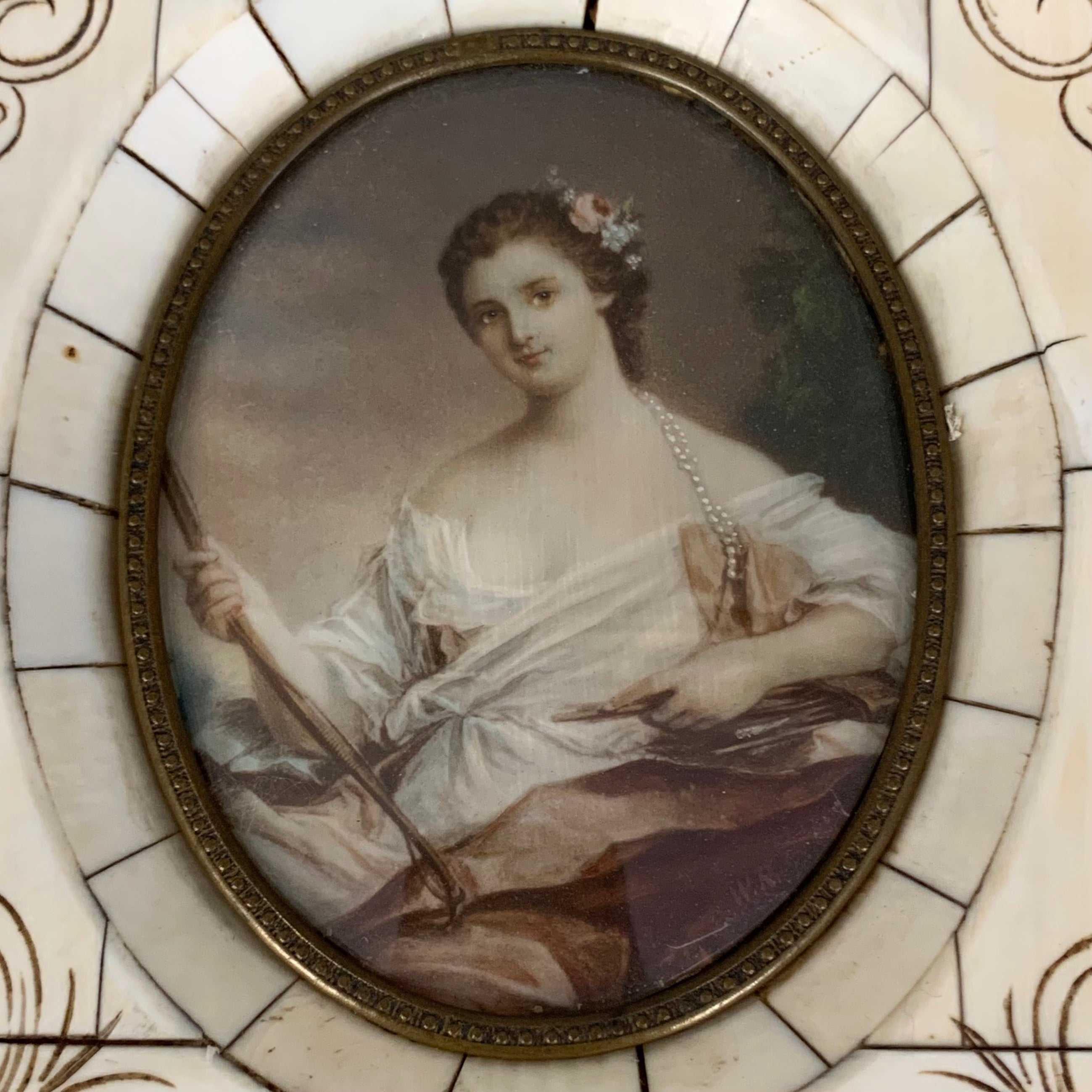 Miniatura escuela francesa rodeada en bronce y enmarcada en diente de cachalote.