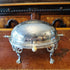 Espectacular servidor giratorio de plaque Elkington. Birmingham, Inglaterra SXIX. Tiene una forma ovalada con tapa grabada decorada con guirnaldas y flores con un asidero con bola de marfil. En el interior se observa 3 bandejas una sobre otra. Todo reposa sobre cuatro patas decoradas con guirnaldas terminadas en pata de leon. Inglaterra SXIX época Victoriana.