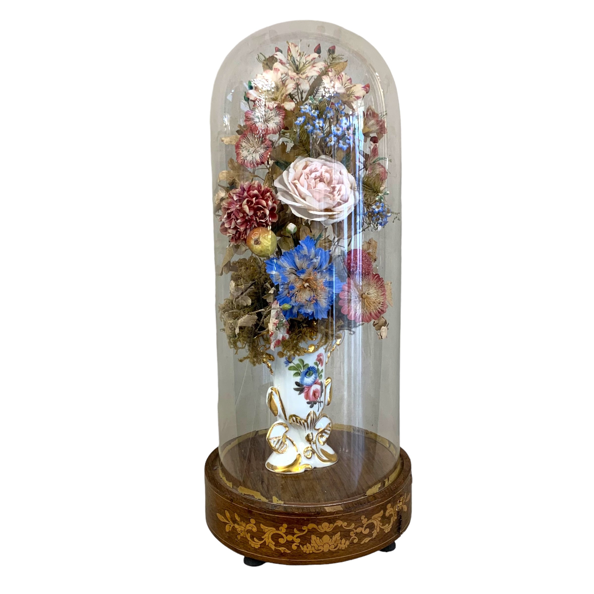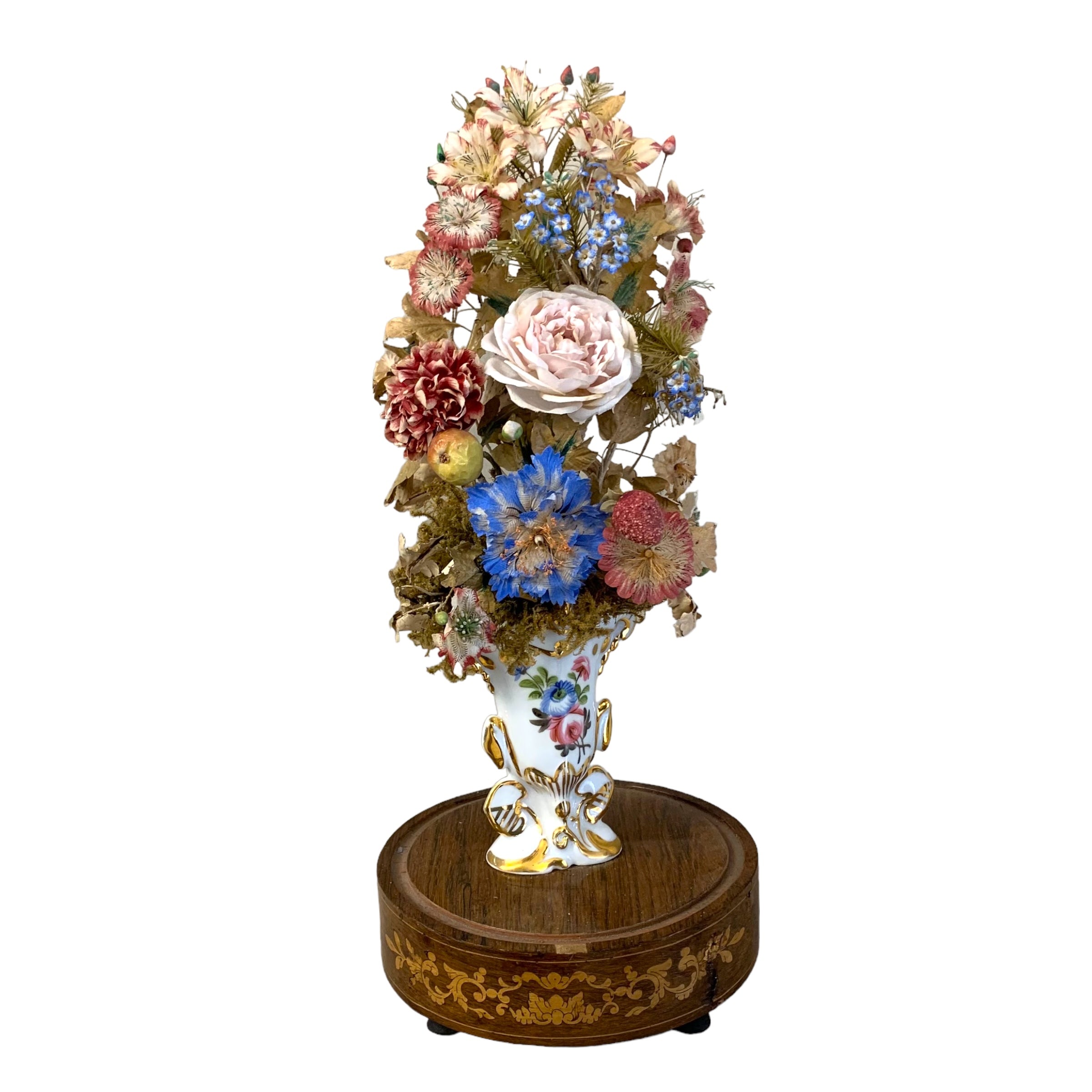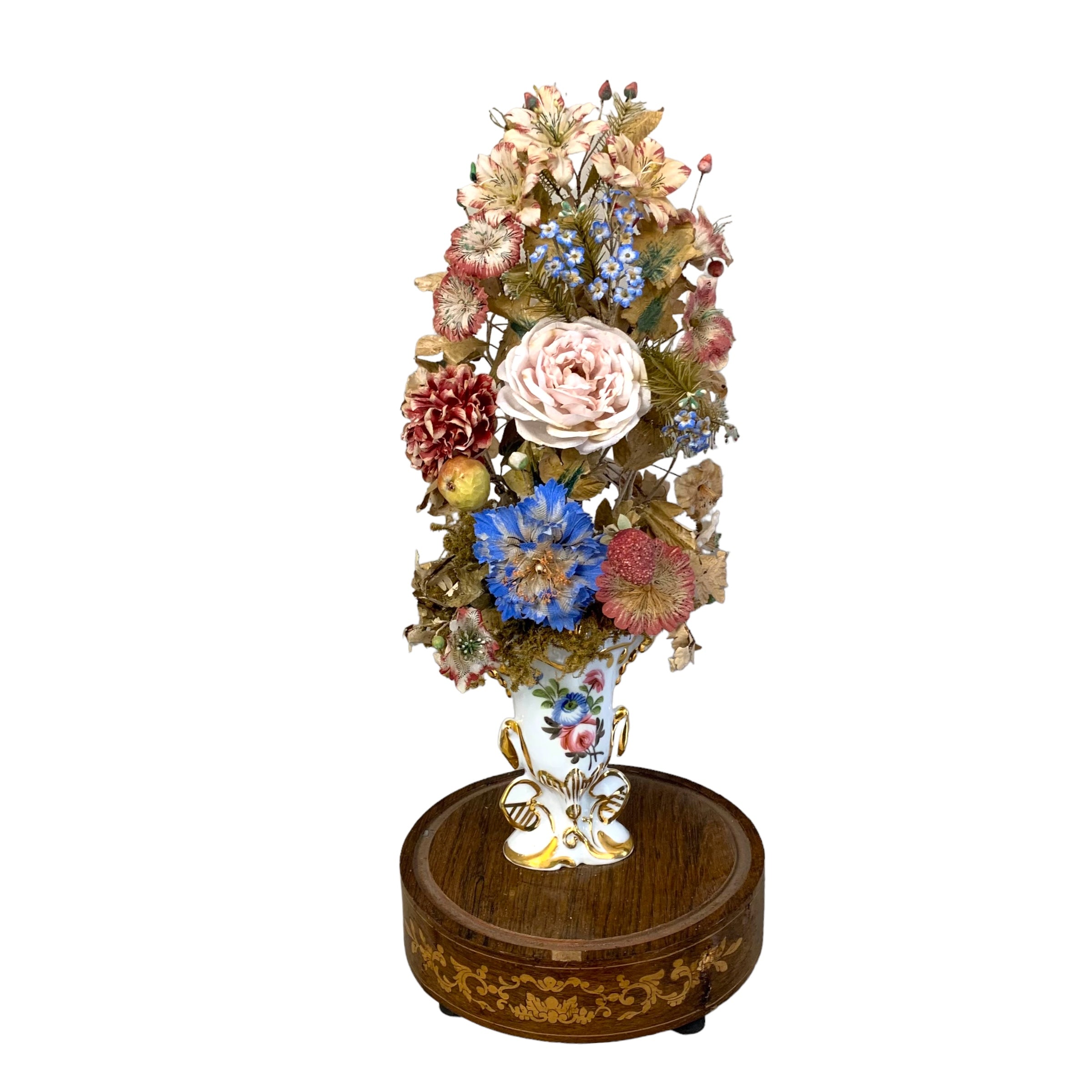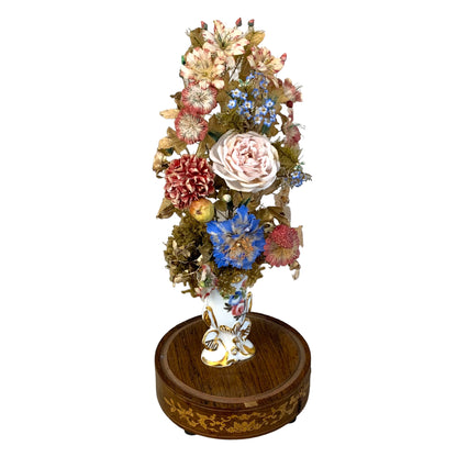 Fanal francés mostrando el "ramo de la novia" que consiste en una porcelana viejo parís con vivos dorados sosteniendo un arreglo floral en seda y raso. Todo descansando en una base de jacaranda con marquetería.