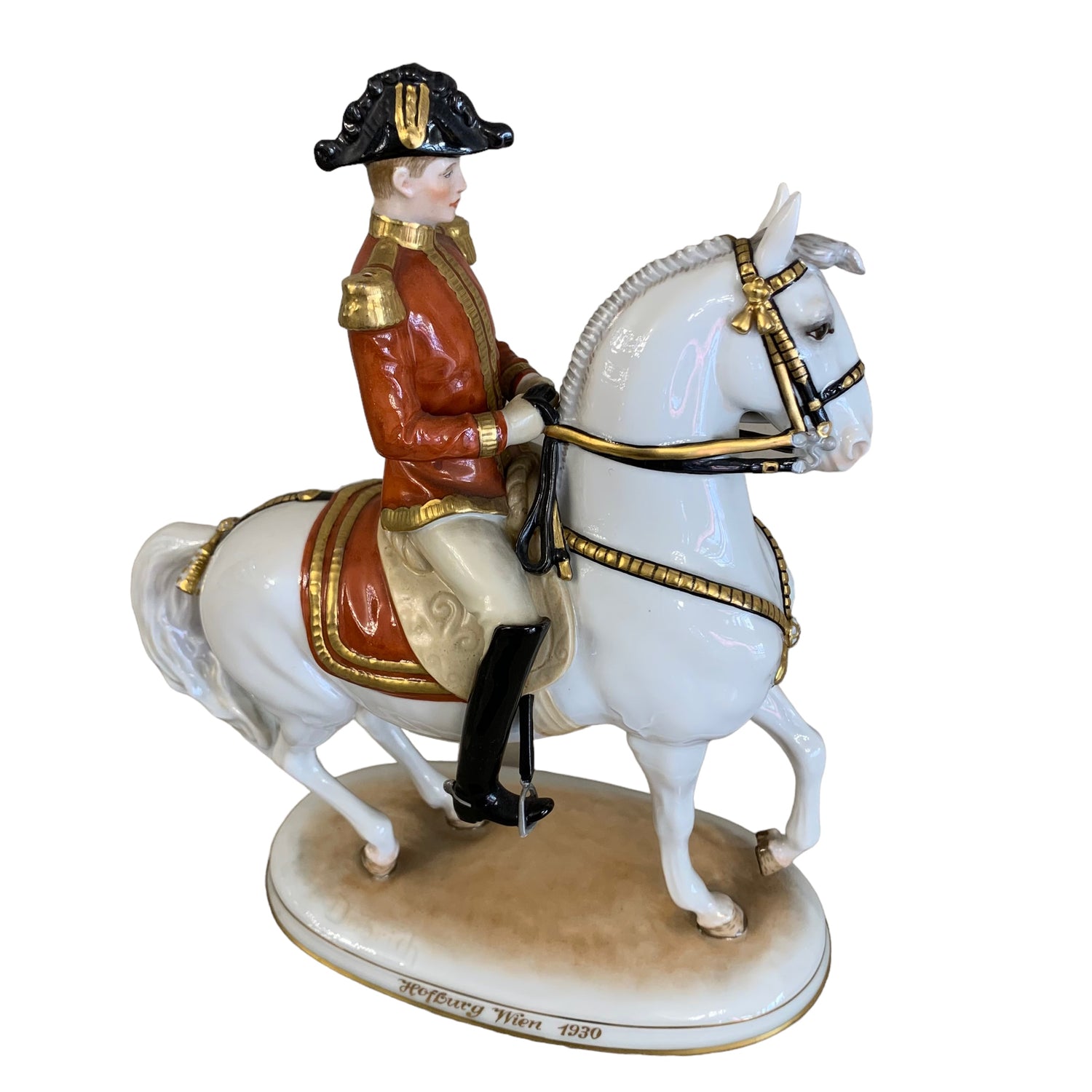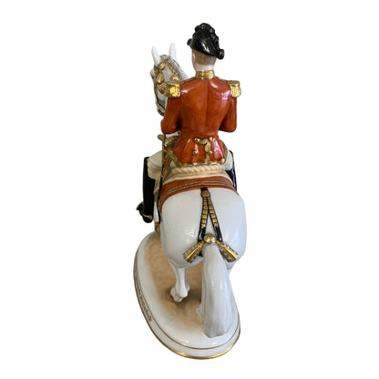 Figura de porcelana belga sellada Viejo Viena. Representa a un jinete sobre su caballo de paso de la escuela española.