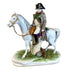 Figura de porcelana alemana del general Napoleón con traje tradicional, chaquetin verde, abrigo largo, montado en un semental blanco sobre el campo de batalla.