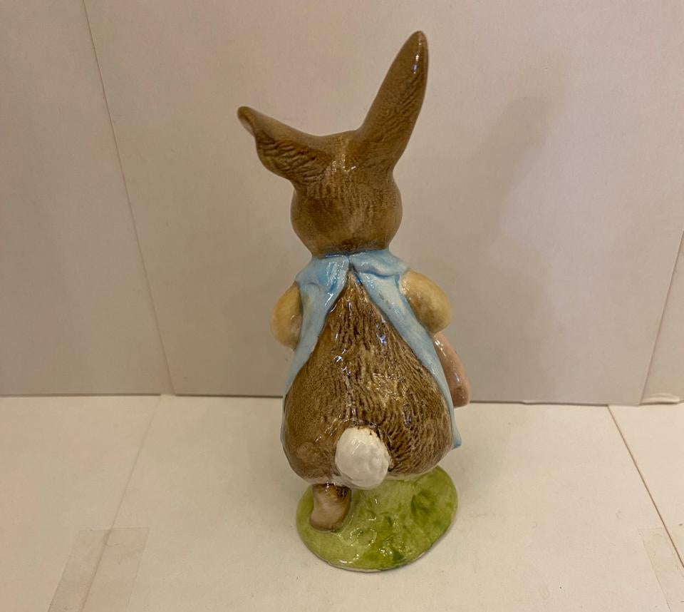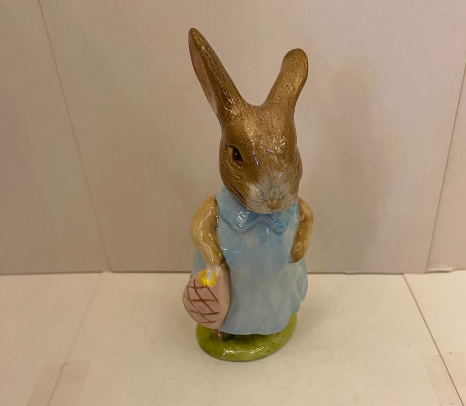 Figura de porcelana inglesa Royal Albert "Mrs Flopsy Bunny" de una coneja con bolsa para el mercado.