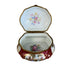 Gran joyero de porcelana francesa sellada Sevres pintada con un fondo burdeos y escenas galantes todo con vivos en pintura al oro. En su interior se ve un motivo florales sobre un fondo blanco.