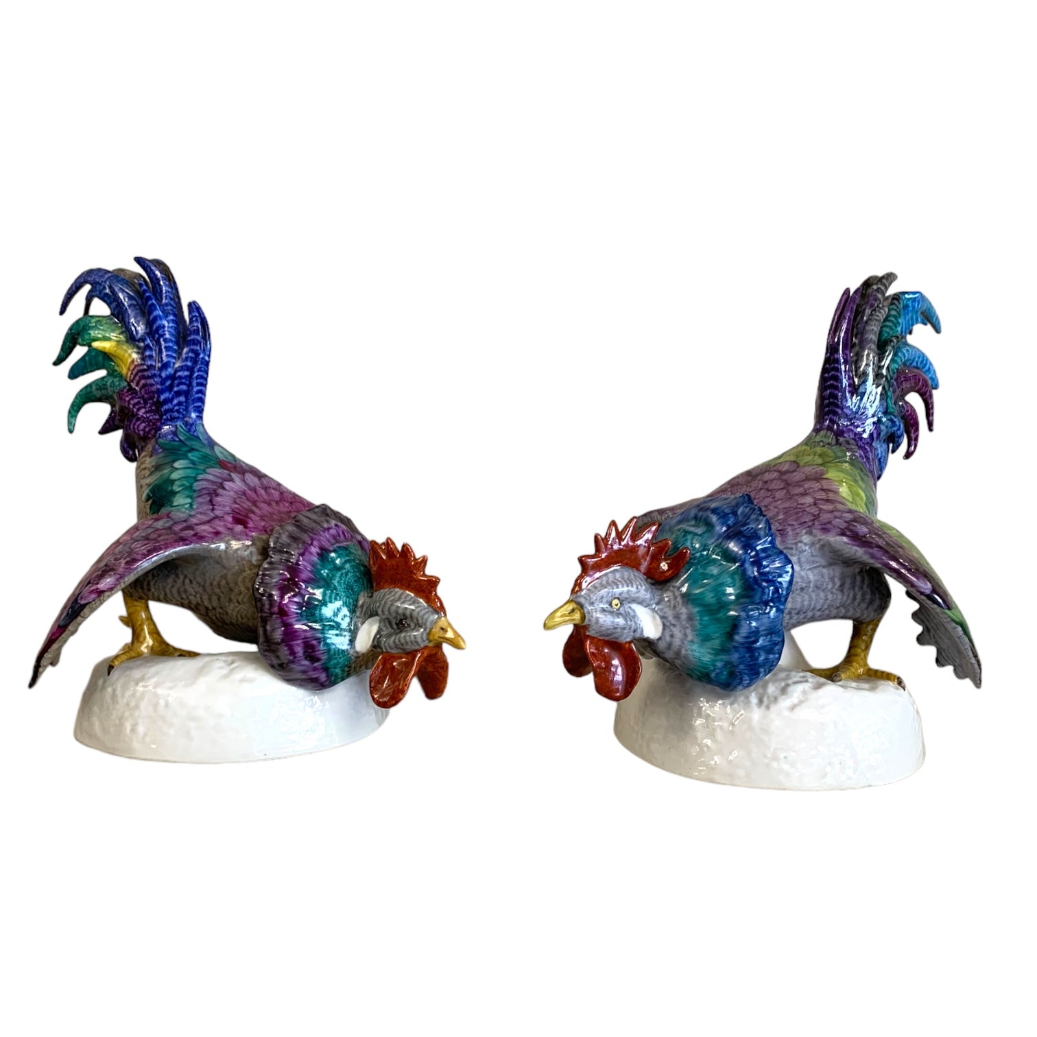 Par de gallos alemanes de porcelana en posición de pelea. SXIX